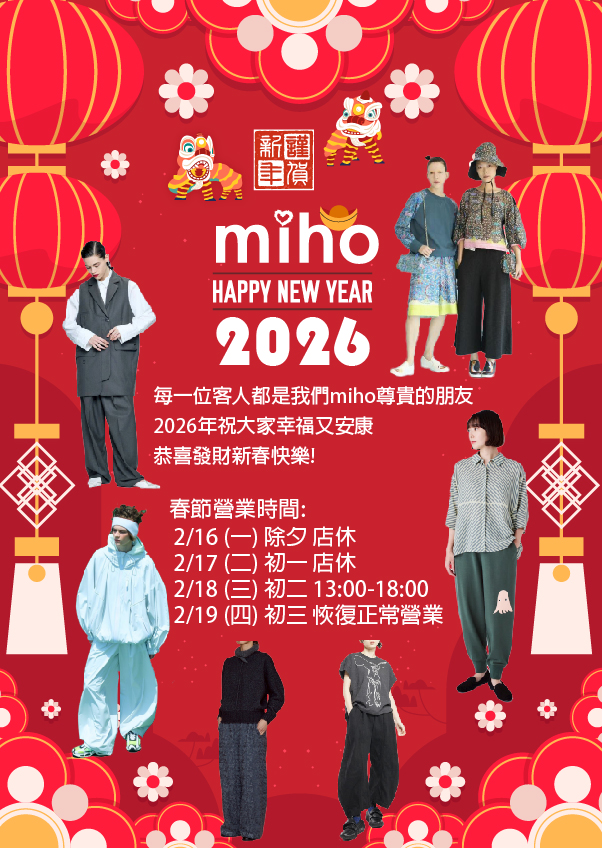 miho預祝各位新年快樂 平安又安康馬年大吉幸福來,家家喜氣賀新春 春節營業時間為 2/16 (一) 除夕 店休 2/17 (二) 初一 店休 2/18 (三) 初二 13:00~18:00 2/19 (四) 初三 恢復正常營業 -miho 忠孝敦化門市臺北市敦化南路一段233巷30號2樓 -tsumori chisato 忠孝敦化旗艦店~台北市敦化南路一段233巷37号 ~Line id : @swh8350i ~IG : http://instagram.com/mihofamily ~FB: https://www.facebook.com/mihofamily/