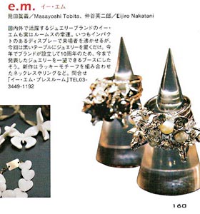 本季的e.m. 發表Bridal,little emblem e.m.,CHERISH e.m.,CHarms e.m,ANNIVERSARY,CABARET e.m.等六個系列, 大多都以銀925為主要材質。classic(經典)的主題引導下,設計師創新的在黑色瑪瑙上烙印上古希臘人像, 再用純銀珍珠底座由下方襯托. 此外, 黑瑪瑙與彩色透明丙烯醛基的蝴蝶結型的吊飾和戒子也是重點之一.